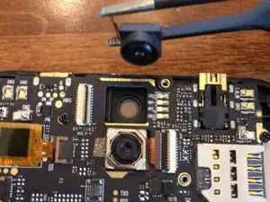 Используйте лопаточку, чтобы отщелкнуть ленточный кабель от материнской/логической платы. Осторожно используйте тупые пинцеты или пинцет под углом, чтобы вытащить ленточный кабель из разъёма. Затем с помощью пинцета выведите камеру из её гнезда.