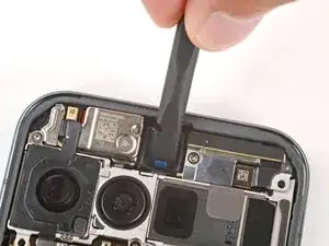 Используйте острие лопатки, чтобы сдвинуть защёлку кронштейна фронтальной камеры внутрь и вверх для освобождения.