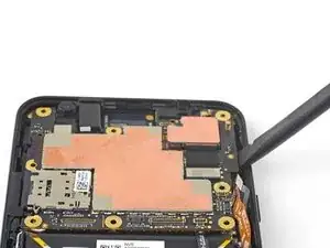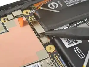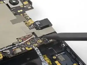Используйте кончик лопатки, чтобы приподнять и отключить межкомпонентный гибкий кабель от его гнезда на плате.