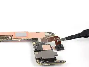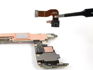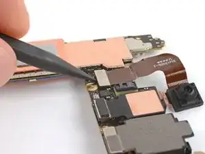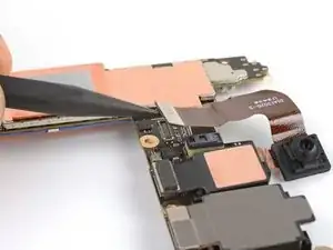Используйте острый наконечник лопатки или ноготь, чтобы приподнять и отсоединить защёлкивающийся разъём фронтальной камеры.