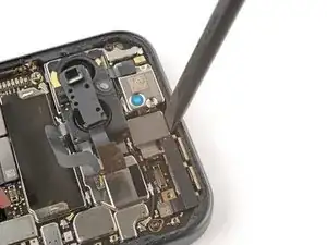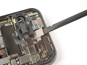 Используйте кончик лопатки, чтобы приподнять и отключить нажимной разъём фронтальной камеры.