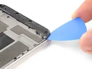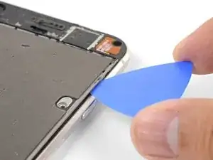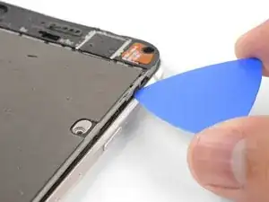 Вставьте медиатор в правый край телефона и проведите им вверх по направлению к защелке в правом верхнем углу.