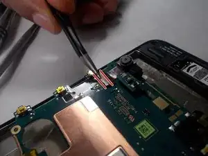 С помощью пинцета приподнимите белую часть разъёма и отсоедините камеру от материнской платы.