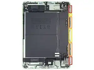 На правом краю iPad расположены магниты экрана, кабели дисплея и кабель цифрового преобразователя. Эти компоненты легко повредить, если слишком глубоко вставить разделительный инструмент.