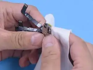 Осторожно отодвиньте разъёмы кабелей Face ID от логической платы, чтобы получить доступ к разъёму селфи‑камеры под ними.