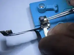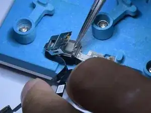 Переверните модуль фронтальной камеры и закрепите его в держателе. Нагрейте феном (горячим воздухом) до 100 °C, чтобы снять ленту.