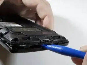 Держите телефон в руке и поместите небольшой пластиковый инструмент для открывания или палец под край телефона рядом с USB-портом.