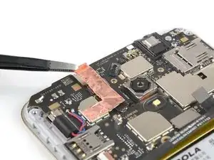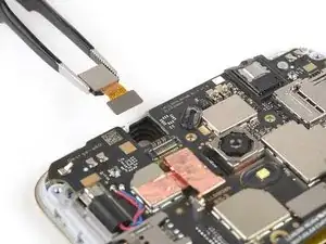 Используйте пинцет, чтобы снять медную ленту, закрывающую разъем гибкого кабеля фронтальной камеры.