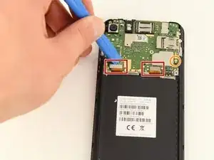 Удалите кабель с креплением, который удерживает камеру на задней стороне материнской платы, с помощью пластикового инструмента для открытия.