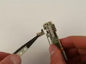 Осторожно снимите клейкую ленту, удерживающую фронтальную камеру, используя пинцет, и извлеките камеру из телефона.