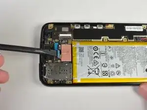 Используйте монтажный инструмент, чтобы перевернуть широкий фиксатор ZIF-разъёма кабеля дисплея, расположенного вверху справа телефона.