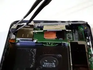 Снимите оранжевую ленту, расположенную в нижнем правом углу телефона, с помощью пинцета.