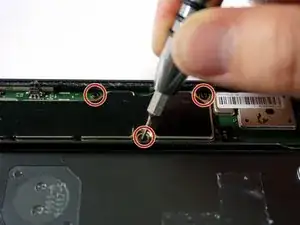 Удалите три чёрных винта 2,6 мм T3 Torx на панели материнской платы сбоку телефона с помощью отвертки, вращая против часовой стрелки.