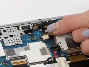Чтобы удалить фронтальную камеру, начните с поднятия белого разъема, чтобы удалить деталь, указанную маркером.