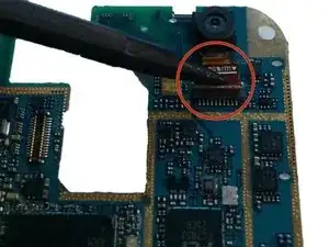 С помощью лопатки или пластикового инструмента приподнимите коричневую защелку ZIF на разъеме фронтальной камеры.