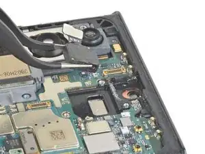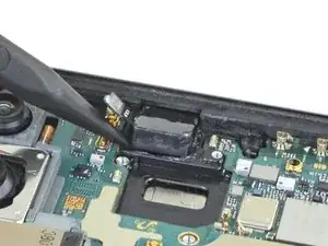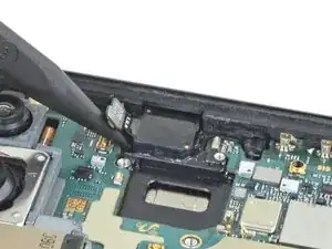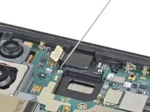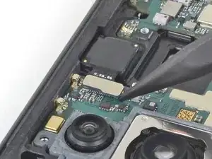 Используйте заострённый конец лопатки, чтобы отсоединить шлейф фронтальной камеры от материнской платы.