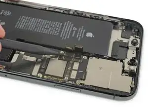 Используйте лопатку или ноготь, чтобы отключить кабели проектора точек и датчика Face ID от их гнёзд на материнской плате.