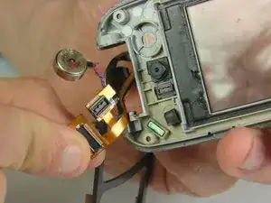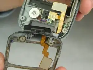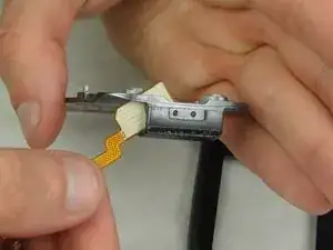 С помощью пинцета вытяните серую пластиковую деталь, окружавшую гибкий кабель, из области шарнира.