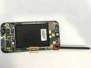 Плата логики приклеена к нижней части телефона небольшим слоем клея. Используя лопатку, поместите её под плату логики с верхнего правого угла и аккуратно сдвиньте в направлении центральной оранжевой отметки, где находится клей. Приложите небольшое давление параллельно плате логики — плата должна ослабнуть и отойти от корпуса.