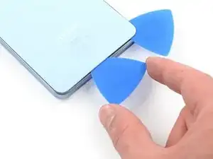 Вставьте второй пластиковый инструмент в верхний правый край телефона.