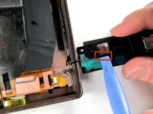 Используйте пластиковый инструмент для вскрытия, чтобы извлечь плату антенны из пластикового корпуса. Этот компонент зафиксирован пластиковыми защёлками, а не клеем.
