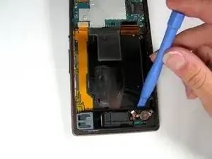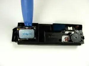 Используйте лопатку, чтобы аккуратно поддеть пластиковый корпус, держащий вибромотор и громкоговоритель.