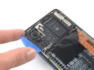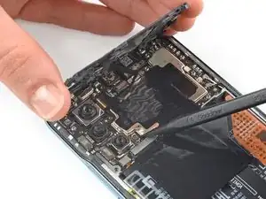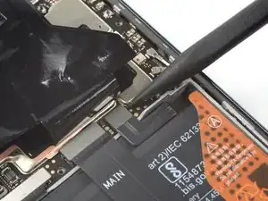Разъём батареи закрыт графитовой фольгой. Осторожно отогните её или закрепите лентой у верхнего края Poco F3, чтобы получить доступ к разъёму батареи.