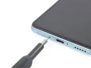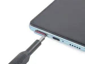 Вставьте инструмент для извлечения SIM-карты или скрепку в маленькое отверстие лотка SIM-карты, расположенное на левом нижнем крае Poco F3.