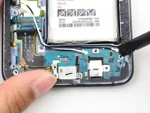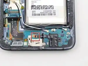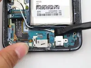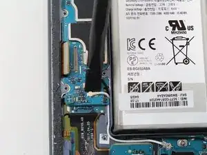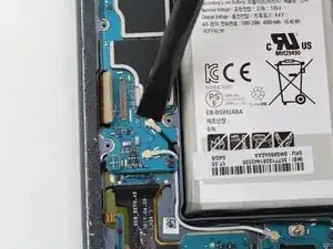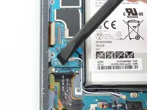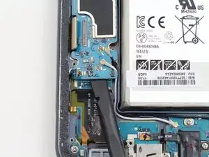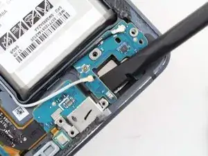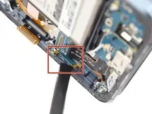 Отсоедините гибкий кабель, соединяющий разъём зарядки с материнской платой, с помощью плоского конца лопатки.
