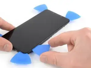 Проведите инструментом вдоль правого края Pocophone F1, чтобы освободить пластиковые защёлки.