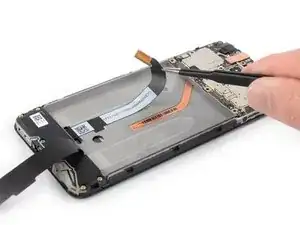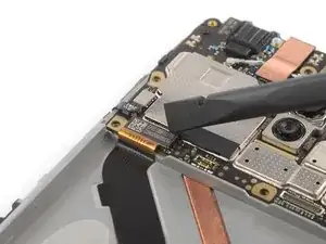 Используйте плоский конец лопатки, чтобы поддеть и отключить гибкий кабель дисплея.