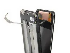 Протяните гибкий кабель дисплея через зазор в металлической рамке и снимите дисплей.