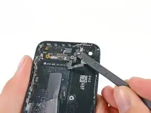 Снимите металлическую пластину разъема батареи с iPhone.