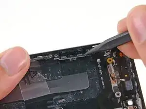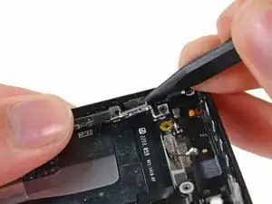 Используйте лопатку, чтобы поддеть кронштейн кнопок регулировки громкости с боковой стороны задней крышки.