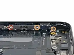 Удалите следующие винты, крепящие кронштейны кнопок регулировки громкости и переключателя беззвучного режима на боковой части задней крышки: