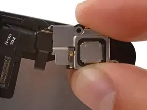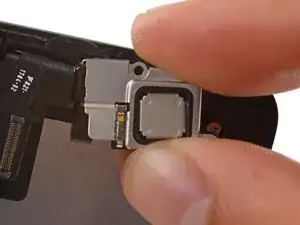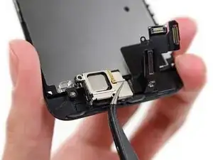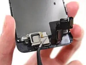 Если вы заменяете датчик приближения, убедитесь, что держатель остаётся приклеенным к задней части дисплея. Если он оторвётся вместе со старым датчиком, снимите его со старого датчика и приклейте небольшой каплей клея обратно к задней части дисплея.
