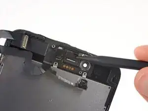 Датчики на этом шаге являются хрупкими. Чтобы увеличить вероятность их извлечения без повреждений, используйте нагреватель iOpener или фен, чтобы нагреть верхнюю часть дисплея перед началом работы. В качестве альтернативы нанесите одну-две капли изопропилового спирта и дайте ему проникнуть под датчики перед тем, как поддевать их.