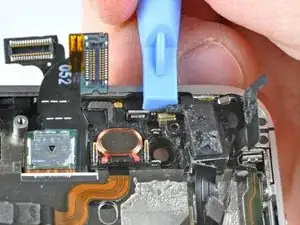 Краем пластикового инструмента для вскрытия подденьте кабель сотовой антенны от его разъема на логической плате.