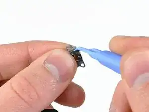 Если вы заменяете кабель разъема для наушников, используйте край пластикового инструмента для вскрытия, чтобы снять стальные кронштейны кнопок громкости и переключателя беззвучного режима.