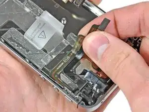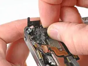 Аккуратно потяните скобу переключателя беззвучного режима от внешнего корпуса и отклейте от внутренней стороны iPhone её маленький ленточный кабель.