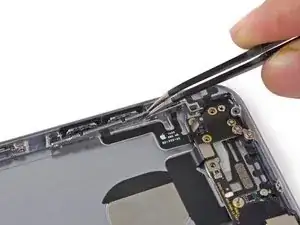 Снимите металлический кронштейн разъёма аккумулятора с iPhone.