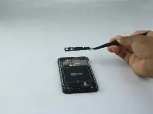 После извлечения винтов снимите крышку динамика и разъёма зарядки с устройства с помощью пинцета.