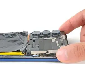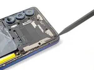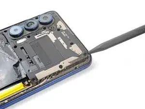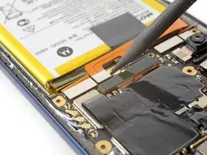 Вставьте лопатку между крышкой материнской платы и средней рамкой на верхней правой кромке телефона.