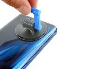Сильно и ровно потяните присоску вверх, чтобы создать зазор между задней панелью и средней рамкой по левой кромке.