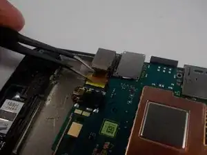 Пинцетом аккуратно отсоедините чёрный и красный провод, чтобы снять материнскую плату.