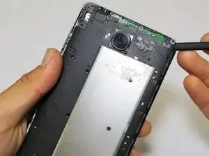 Нажмите на телефон большим пальцем, одновременно вытягивая открывающий инструмент назад кулаком, чтобы начать поддевать заднюю крышку.