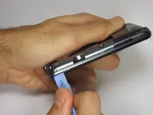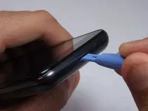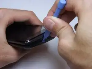 Держите синий пластиковый инструмент для открытия на краю USB-отверстия. Нажмите и аккуратно подденьте корпус телефона.