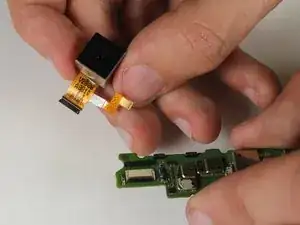 Подключите модуль камеры, вставив чёрный конец плоского кабеля камеры в белый разъём на материнской плате.