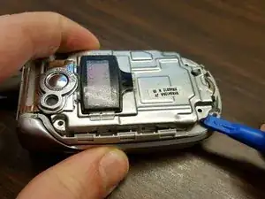Используйте пластиковую открывалку, чтобы отделить внутреннюю металлическую крышку от печатной платы. Приложите усилие, чтобы удалить деталь.