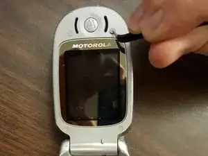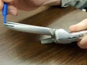 Используйте пластиковую открывалку, чтобы отделить внешнюю оболочку от металлической внутренней крышки, проведя ею вдоль сгиба корпуса.